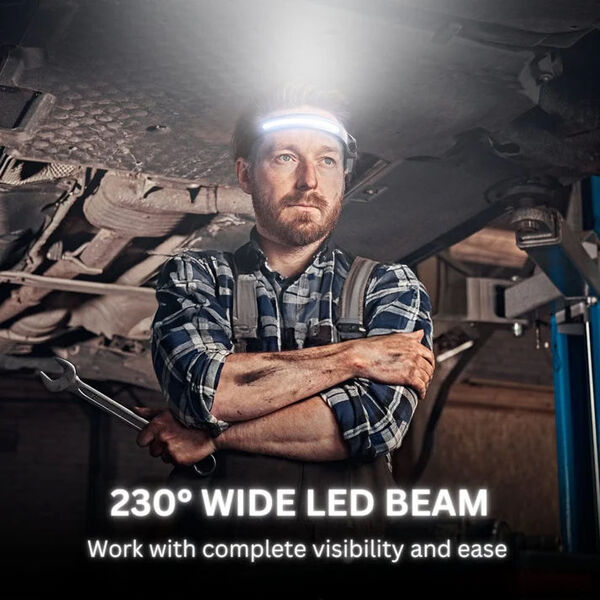 Oświetl całe swoje miejsce pracy dzięki szerokokątnemu strumieniowi 230°. Ta czołówka zapewnia jasną, wyraźną widoczność we wszystkich kierunkach, idealnie sprawdzając się zarówno w pomieszczeniach, jak i na zewnątrz.
